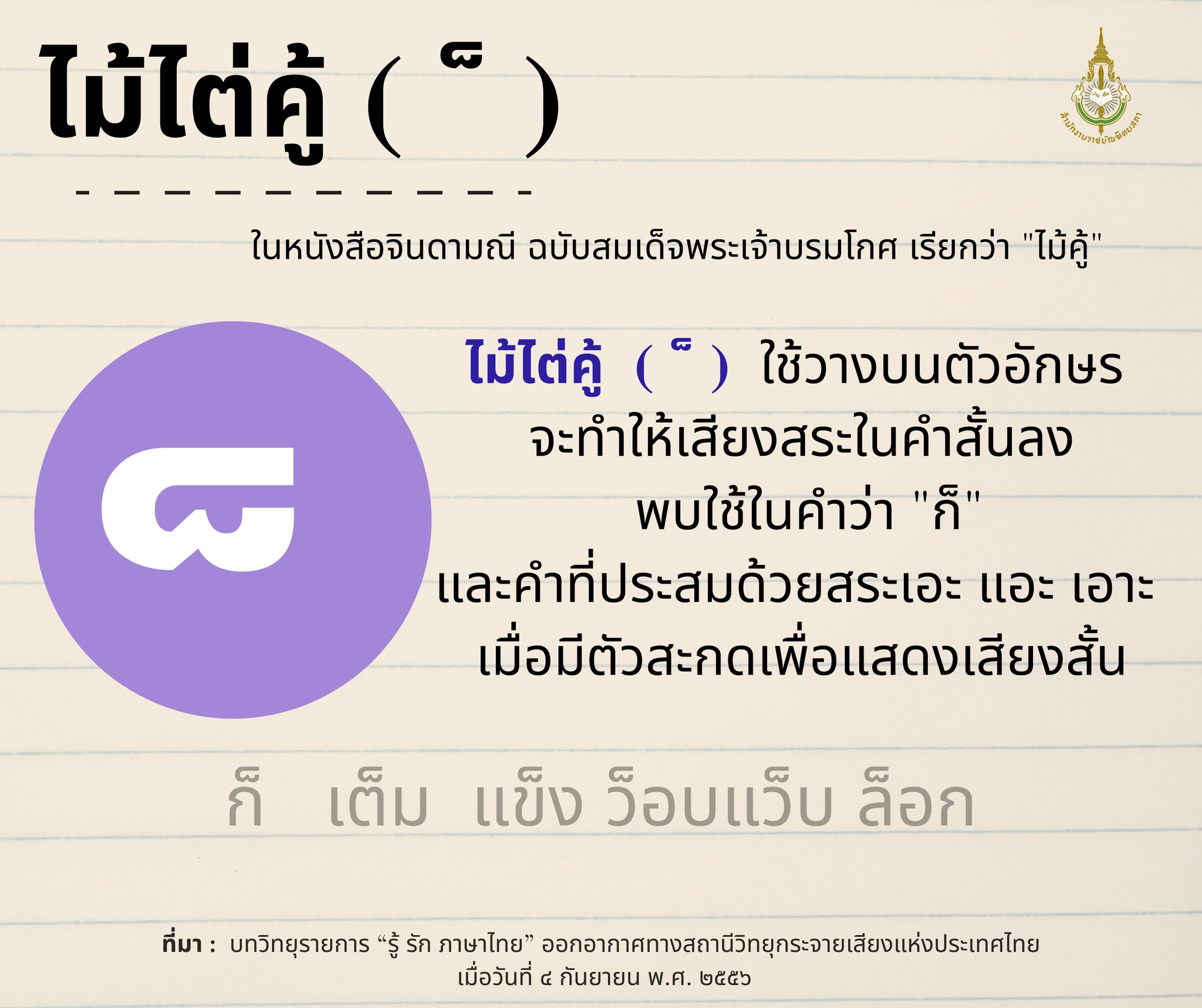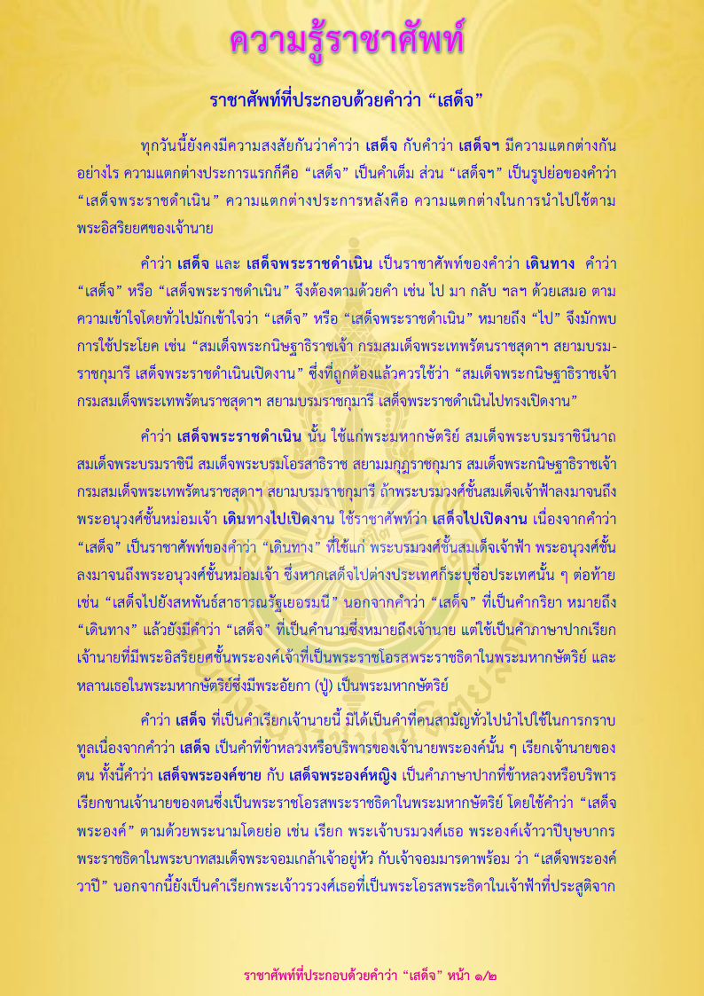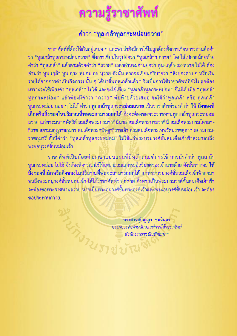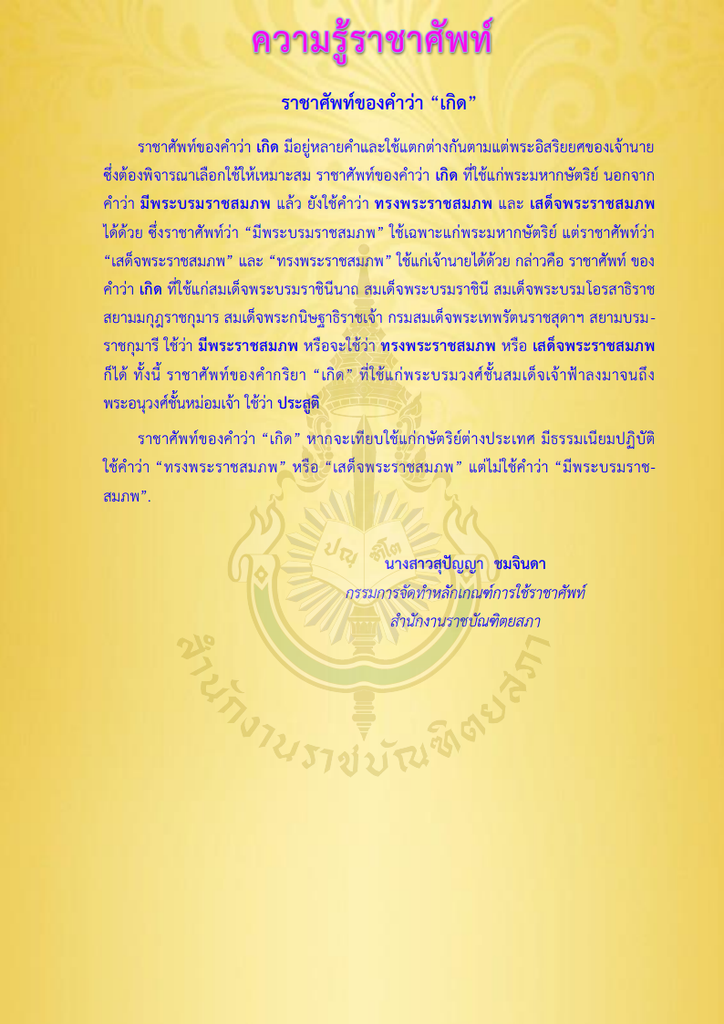เพื่อนำเสนอเนื้อหาที่ดีและมีประสิทธิภาพให้กับท่านมากยิ่งขึ้น โดยการเข้าใช้งานเว็บไซต์นี้ถือว่าท่านได้อนุญาตและยอมรับให้มีการใช้คุกกี้ตามนโยบายการใช้คุกกี้ของสำนักงานราชบัณฑิตยสภา. อ่านเพิ่มเติม