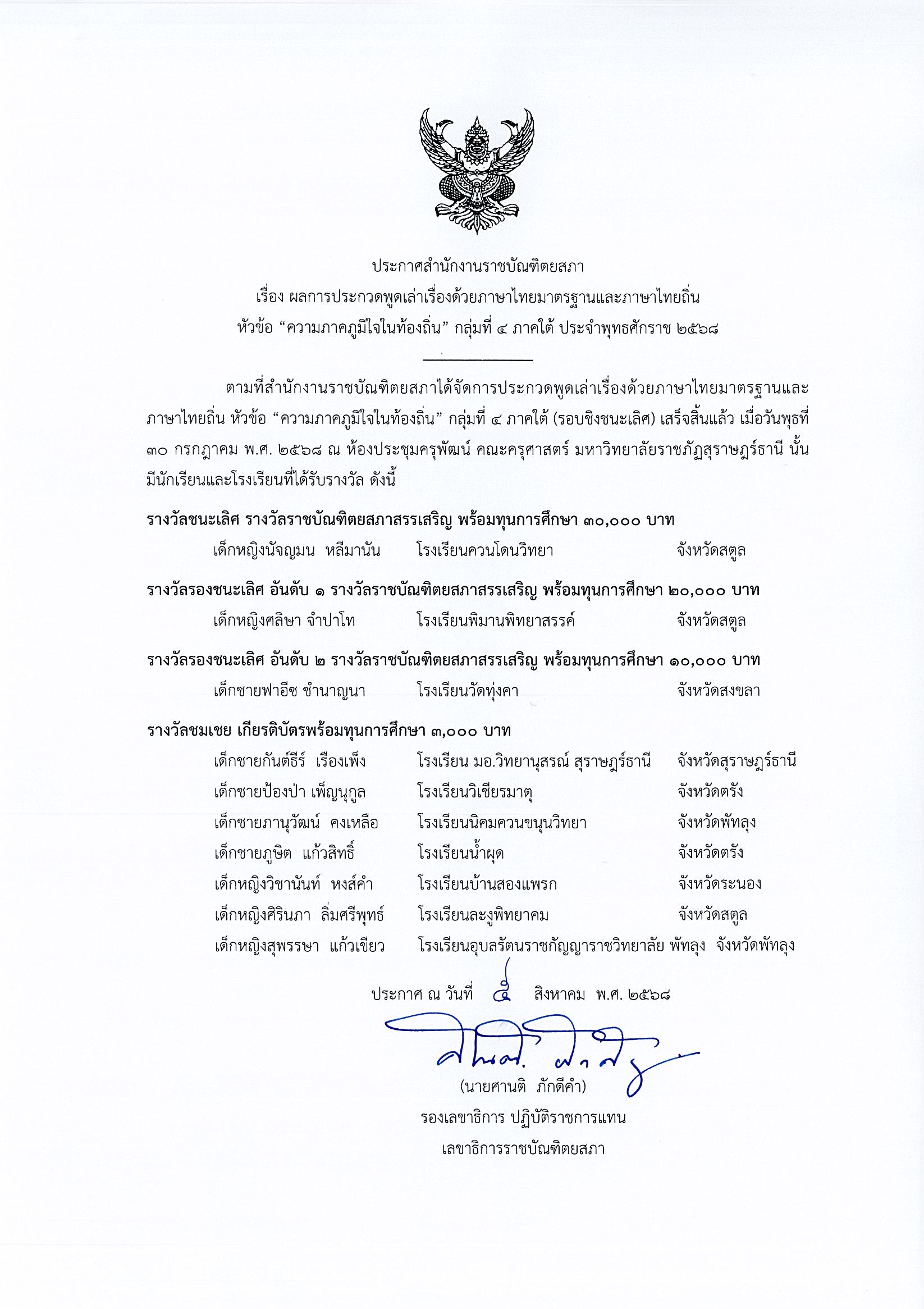 ประกาศผลการประกวดพูดเล่าเรื่องด้วยภาษาไทยมาตรฐานและภาษาไทยถิ่น หัวข้อ “ความภาคภูมิใจในท้องถิ่น” ประจำพุทธศักราช ๒๕๖๘ กลุ่มที่ ๔ ภาคใต้ มีนักเรียนและโรงเรียนที่ได้รับรางวัลตามประกาศที่แนบมาพร้อมนี้